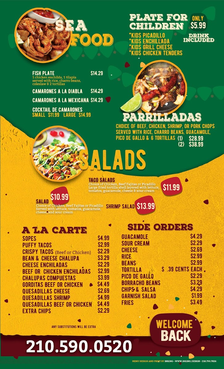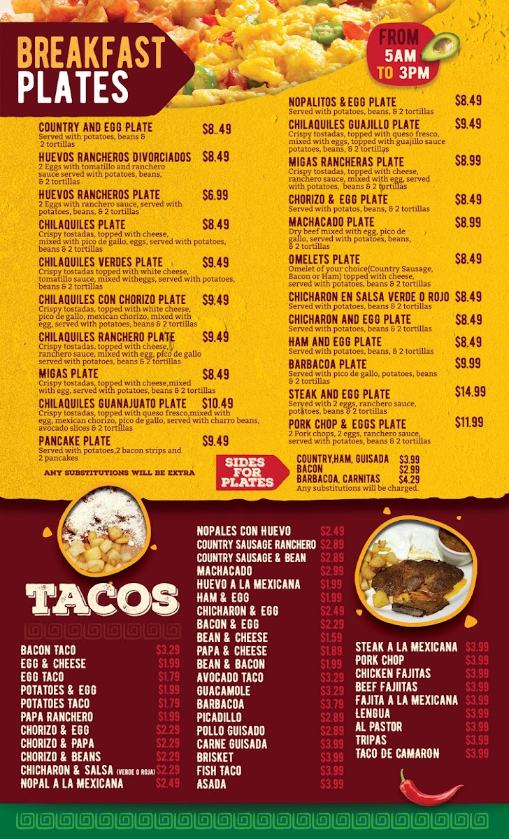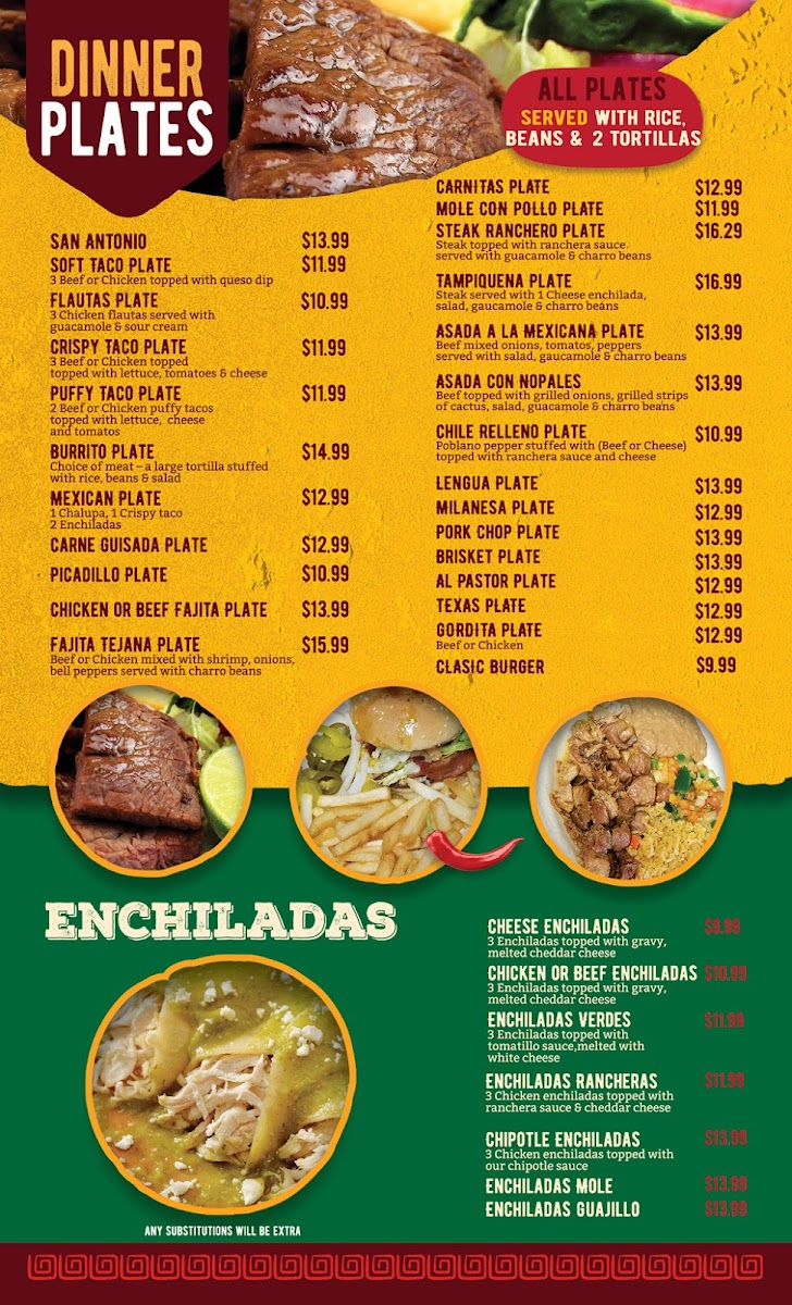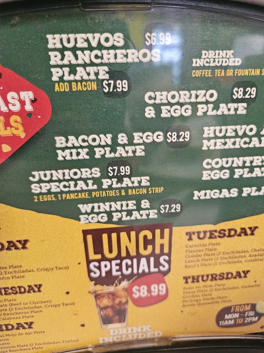 Throughout the day, the menu extends into comforting lunch options such as Beef Quesadillas, Carne Guisada with Cheese, and classic taco salads. The flavors are vibrant yet approachable, perfectly matching the friendly, relaxed environment where you can enjoy fresh chips and salsa or a variety of traditional baked goods like Mexican Wedding Cookies and Gorditas.